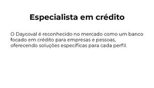 O Banco Daycoval é uma instituição financeira sólida e reconhecida nacionalmente, com atuação há mais de 50 anos no mercado. Especializado em crédito para pessoas e empresas, o Daycoval combina tradição, segurança e inovação para oferecer soluções financeiras completas. Com processos digitais, atendimento consultivo e total transparência, o banco disponibiliza linhas de crédito flexíveis, taxas competitivas e prazos estendidos, ajudando seus clientes a crescer, investir e alcançar estabilidade financeira com confiança.